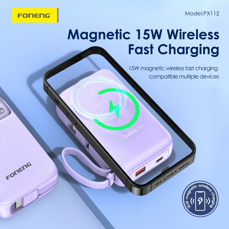 Stay powered up anytime, anywhere with the FONENG PX112, a compact and stylish 10000mAh power bank designed for modern convenience. Featuring 22.5W fast charging, magnetic wireless charging, and dual built-in cables, this power bank is ideal for smartphones, earbuds, and USB-compatible devices.