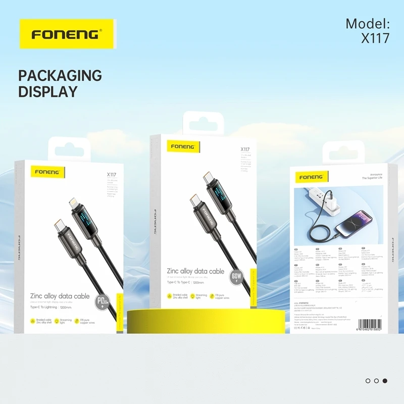 The FONENG 1.2M Flowing Light Zinc Alloy Head Braided Cable X117 features a durable and stylish design with an aluminum alloy digital display woven style and unique cool streamer light charging display. With 178 pure copper wires for high current and high power output of CC-60W Max and PD30W Max, this cable supports fast charging for laptops. The 1.2M line length and OD4.0 thickened line body make it adaptable to various scenarios while ensuring strength and durability.