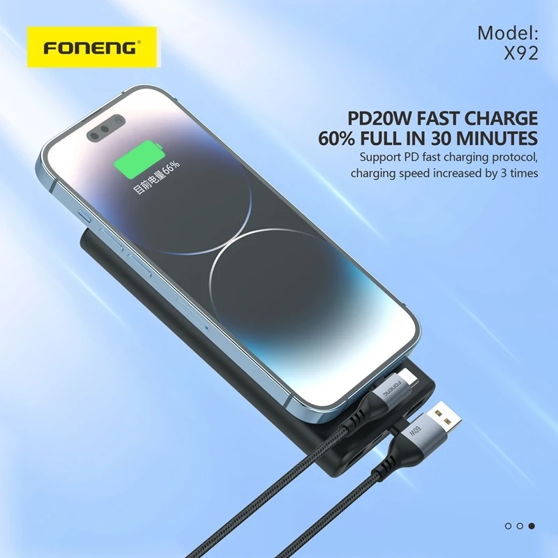 The FONENG X92 is equipped with USB-A and USB-C inputs, plus Type-C and Lightning outputs, allowing you to charge a wide variety of devices including: