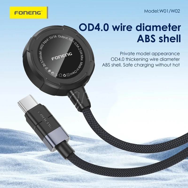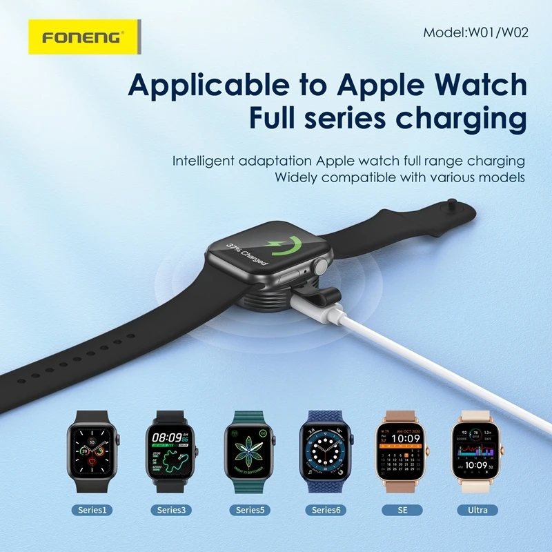 The FONENG W02 is a magnetic wireless charger designed with a private mold appearance and thick wire diameter, ensuring a strong and secure connection. The ABS shell and safe charging technology prevent the device from overheating, making it an ideal choice for charging the entire Apple Watch series. With its strong magnetic suction and safe charging capabilities, this charger combines both practical and value attributes to provide a reliable and efficient charging solution for Apple Watch users.
