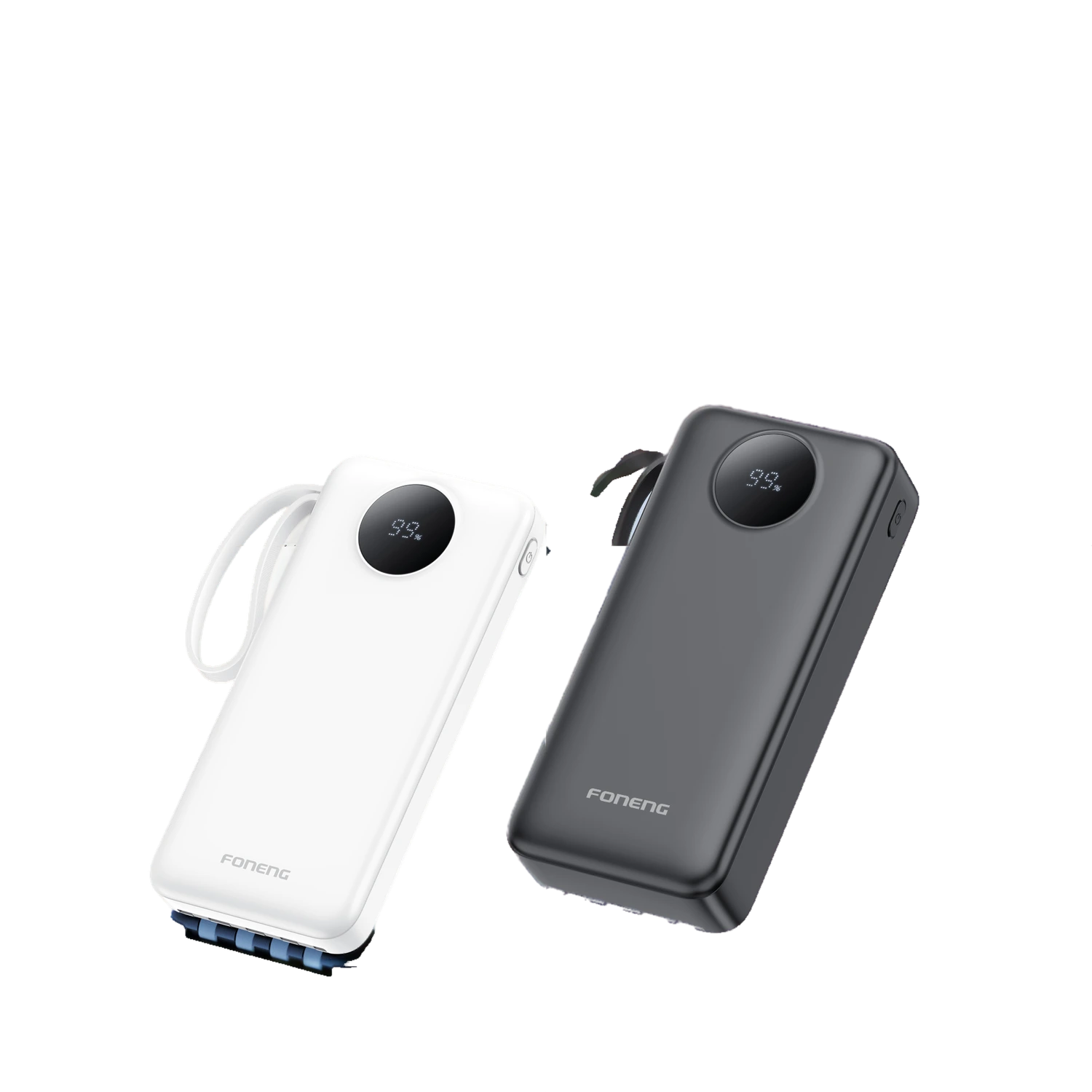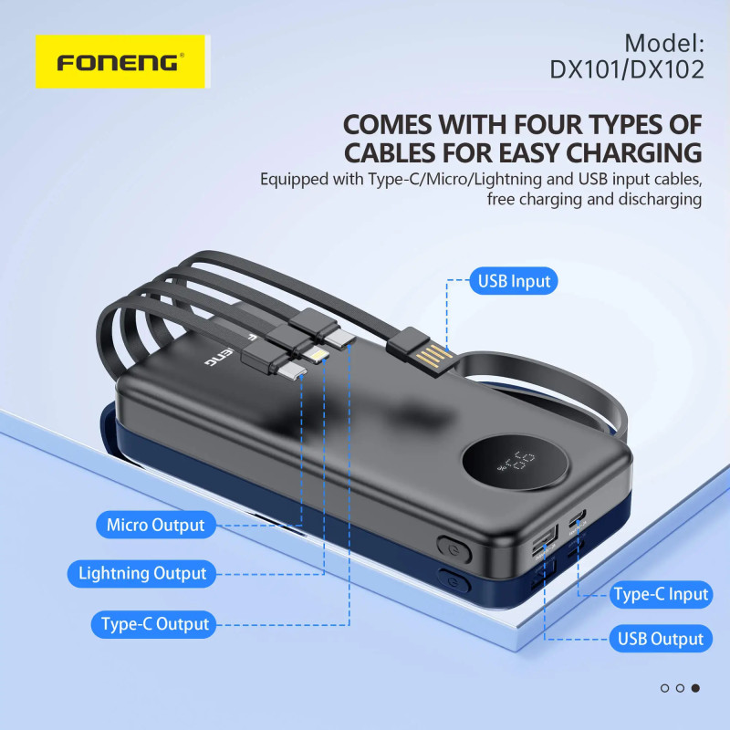 Stay powered up wherever you go with the Foneng DX101 10,000mAh Power Bank, designed for convenience, portability, and reliable performance. Featuring 4 built-in charging cables (Micro, Lightning, Type-C, and USB), you’ll never have to worry about carrying extra cords.