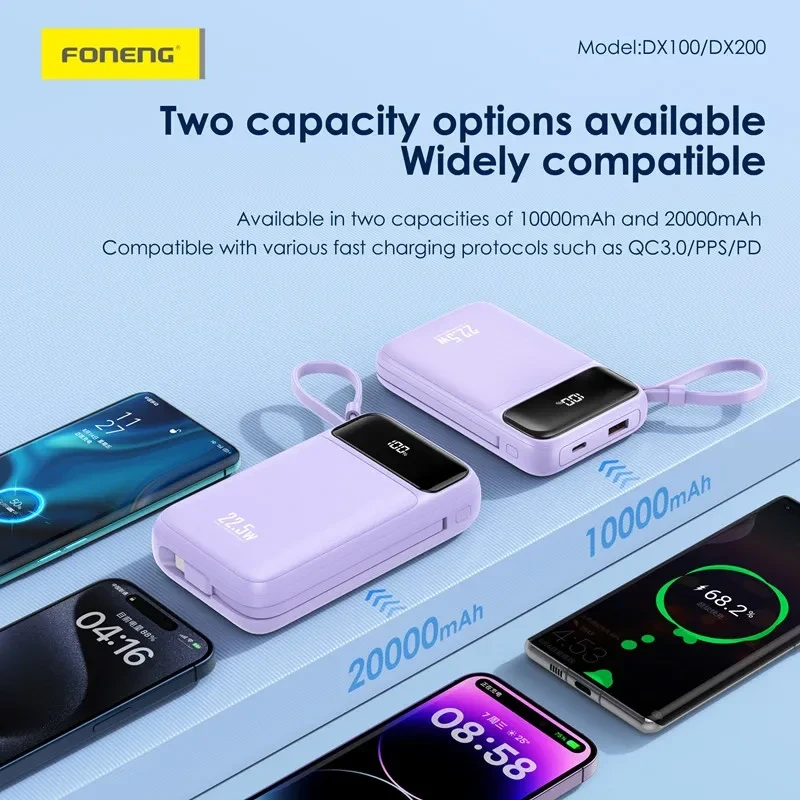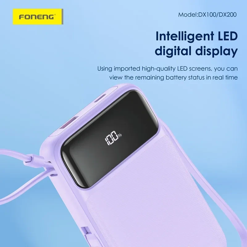The Foneng DX200 20,000mAh Power Bank is a powerful, travel-ready charging solution designed for convenience and speed. With two built-in cables (Type-C & Lightning), you’ll never have to worry about carrying extra cords.