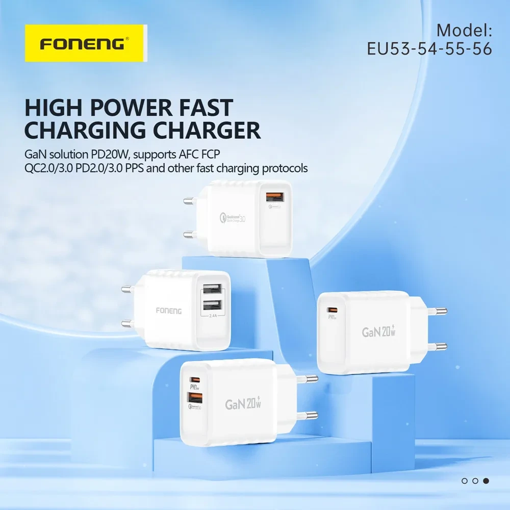 Power up your devices quickly and safely with the FONENG EU56, a high-efficiency 20W GaN (Gallium Nitride) wall charger featuring dual ports – USB-A + USB-C. Built for performance and convenience, this compact charger is specially optimized for Huawei smartphones, while also supporting a wide range of devices with universal fast-charging protocols.