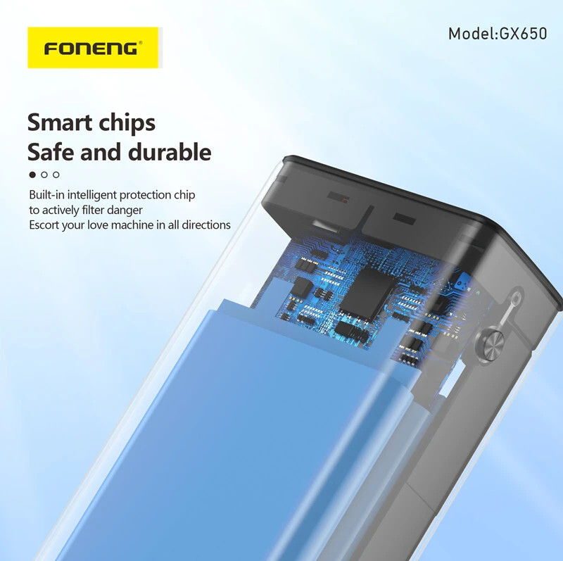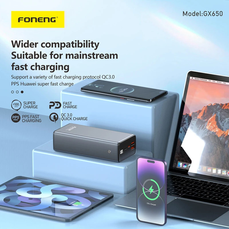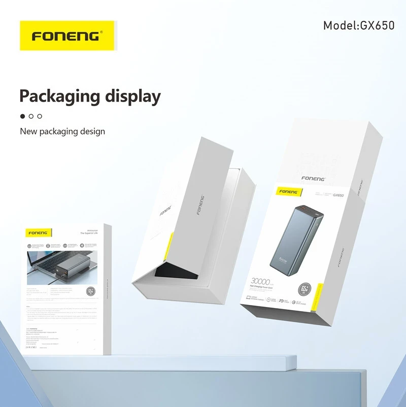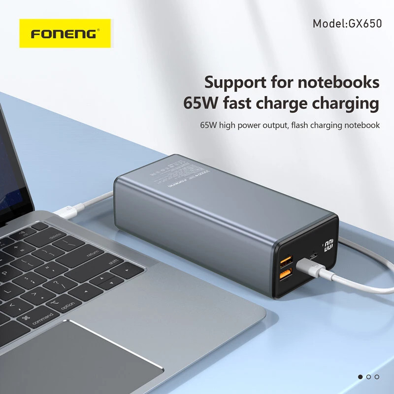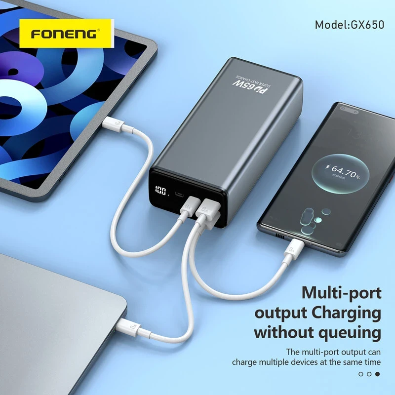 The Foneng GX650 65W 30,000mAh Power Bank is a powerful, versatile charging solution for smartphones, tablets, laptops, and more. With three output ports and support for multiple fast-charging protocols (PD, QC3.0, PPS), it delivers efficient and rapid charging for multiple devices simultaneously.
