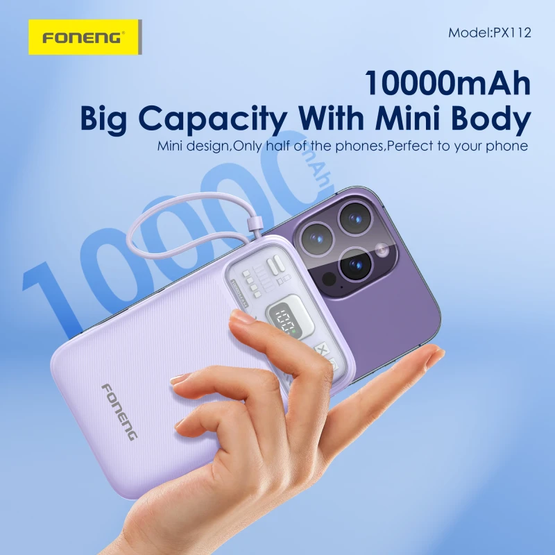 Stay powered up anytime, anywhere with the FONENG PX112, a compact and stylish 10000mAh power bank designed for modern convenience. Featuring 22.5W fast charging, magnetic wireless charging, and dual built-in cables, this power bank is ideal for smartphones, earbuds, and USB-compatible devices.