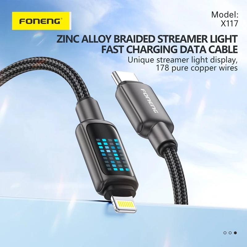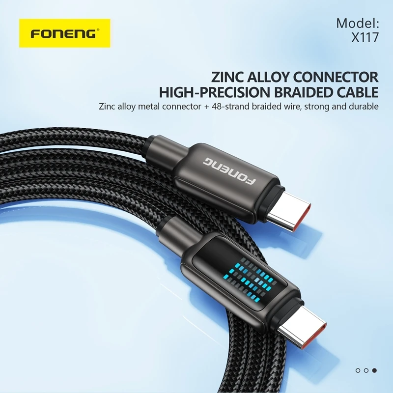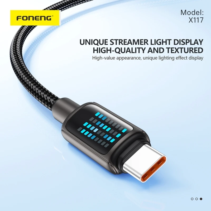 The FONENG 1.2M Flowing Light Zinc Alloy Head Braided Cable X117 features a durable and stylish design with an aluminum alloy digital display woven style and unique cool streamer light charging display. With 178 pure copper wires for high current and high power output of CC-60W Max and PD30W Max, this cable supports fast charging for laptops. The 1.2M line length and OD4.0 thickened line body make it adaptable to various scenarios while ensuring strength and durability.