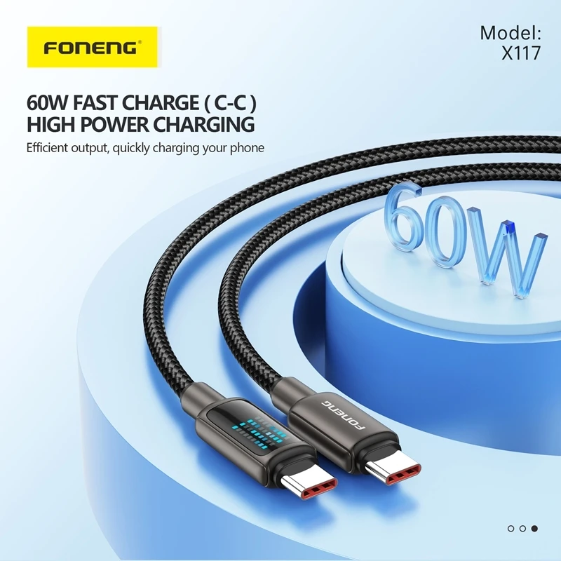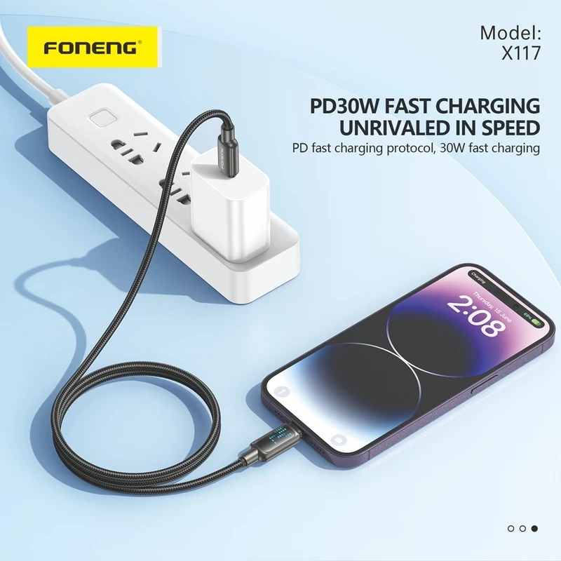 Experience high-speed charging with the FONENG 1.2M Flowing Light Zinc Alloy Head Braided Cable X117, featuring a unique cool streamer light charging display and high power output of CC-60W Max and PD30W Max. The aluminum alloy digital display woven style and 178 pure copper wires ensure durability and versatility, making it ideal for laptop fast charging in various scenarios. The OD4.0 thickened line body adds extra strength, guaranteeing a long-lasting and reliable charging experience.