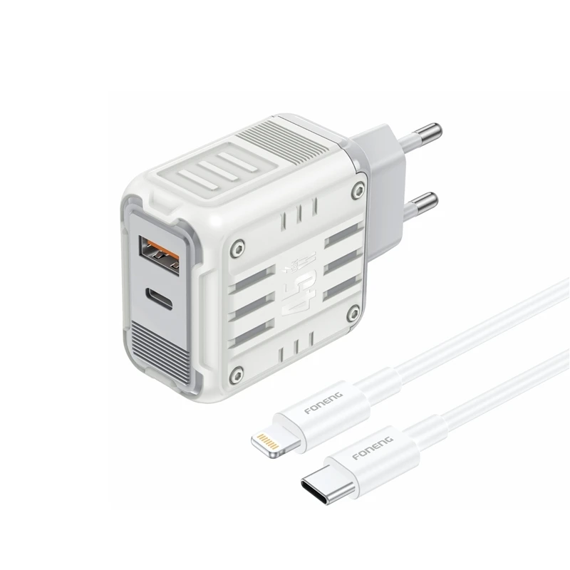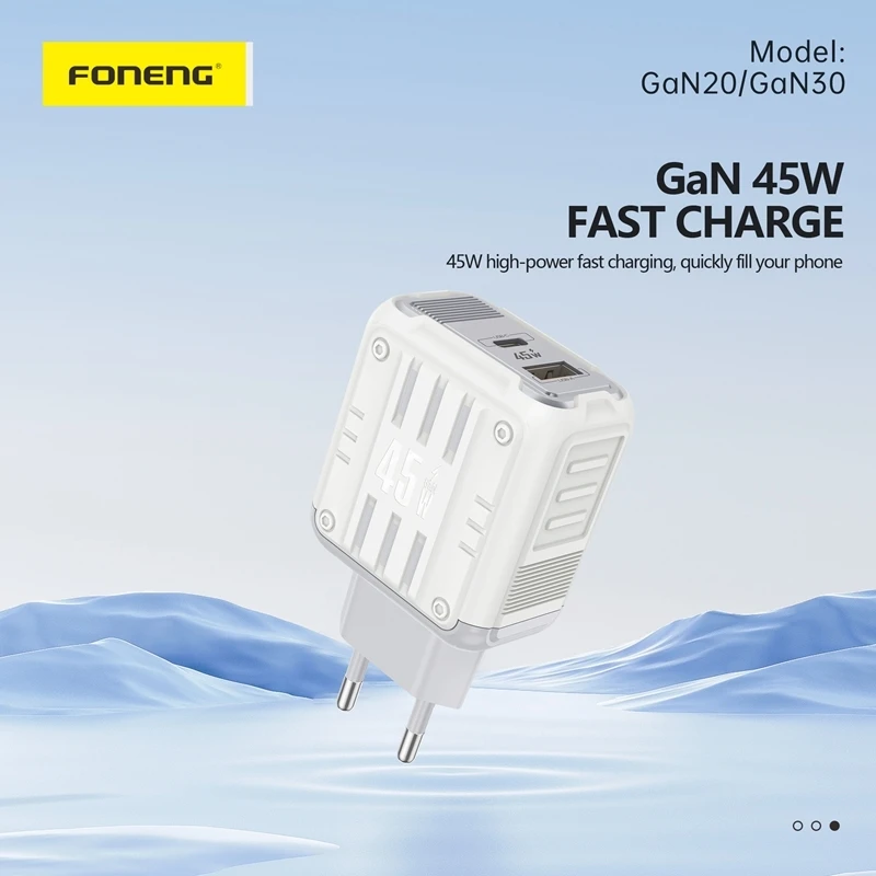 Meet the FONENG GaN20, a next-generation 45W GaN fast charger designed for high-performance, dual-device charging. Featuring both USB-C (PD) and USB-A (QC) ports, this compact powerhouse is capable of charging phones, tablets, laptops, and more—all at lightning speed. Built with advanced GaN (Gallium Nitride) technology, it offers higher efficiency, lower heat, and faster charging in a much smaller body than traditional chargers.