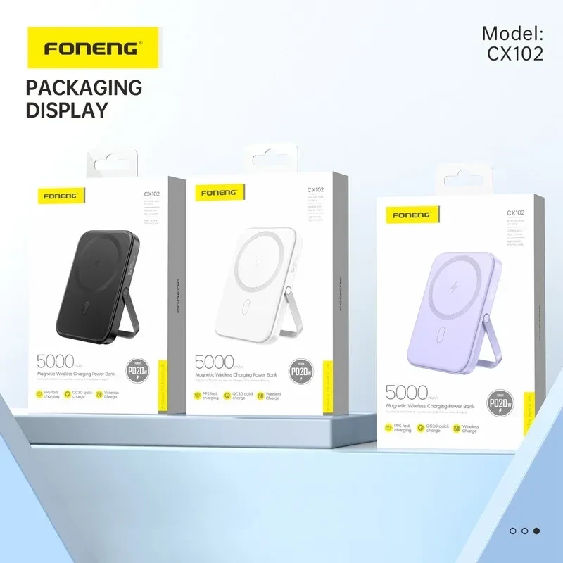 Experience powerful wireless charging in a compact form with the Foneng CX102 5,000mAh Magnetic Power Bank. Designed for convenience and portability, this mini-sized charger delivers up to 15W wireless charging speed, making it perfect for powering up your smartphone without the hassle of cables.