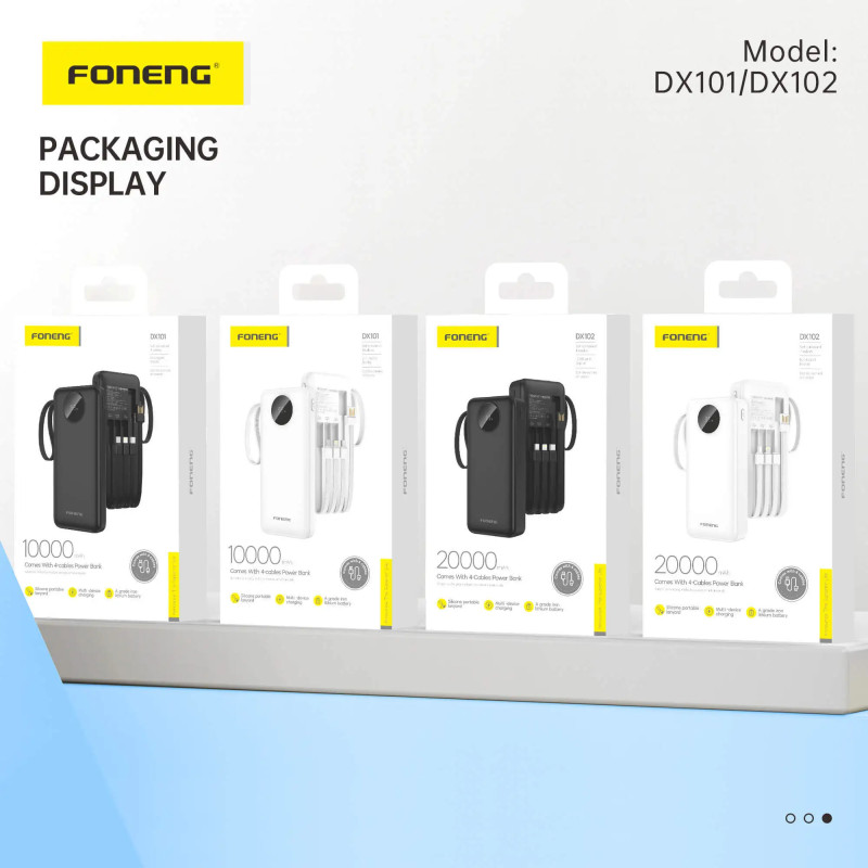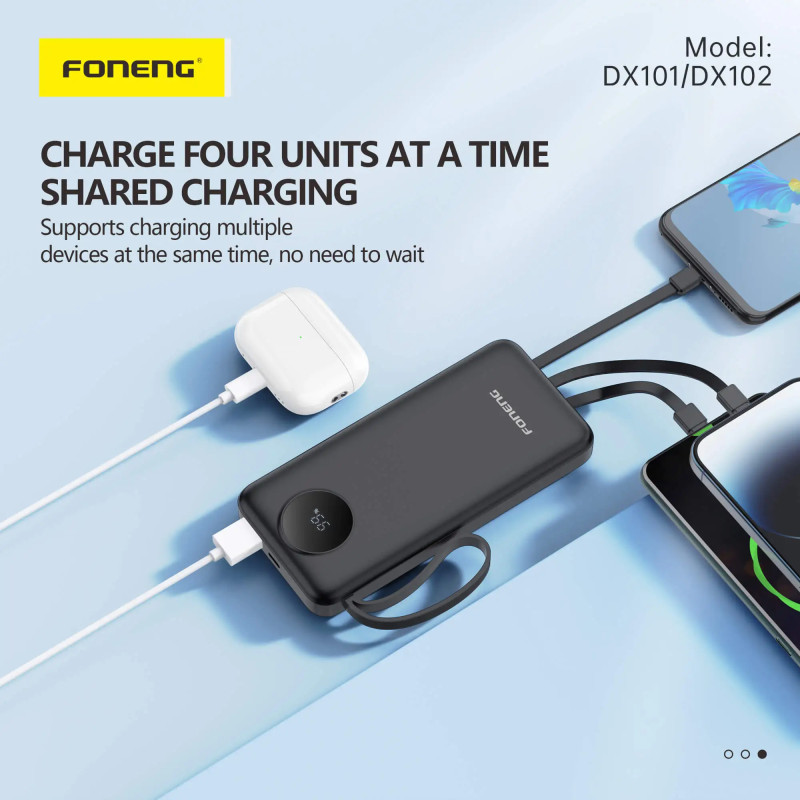 Stay powered up wherever you go with the Foneng DX101 10,000mAh Power Bank, designed for convenience, portability, and reliable performance. Featuring 4 built-in charging cables (Micro, Lightning, Type-C, and USB), you’ll never have to worry about carrying extra cords.