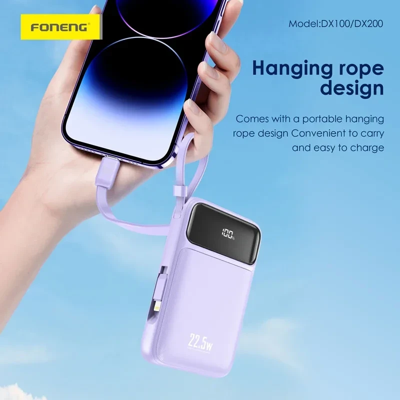The Foneng DX200 20,000mAh Power Bank is a powerful, travel-ready charging solution designed for convenience and speed. With two built-in cables (Type-C & Lightning), you’ll never have to worry about carrying extra cords.