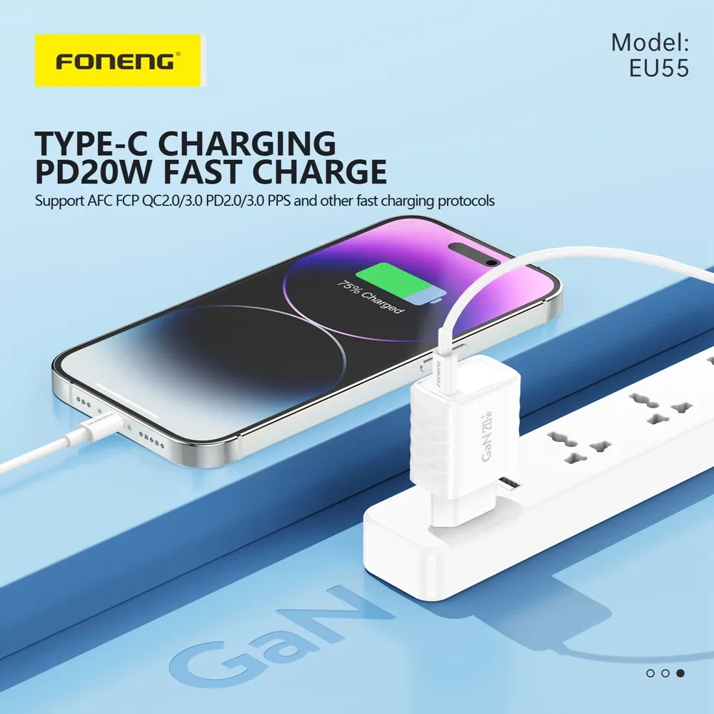 Power up your devices quickly and safely with the FONENG EU56, a high-efficiency 20W GaN (Gallium Nitride) wall charger featuring dual ports – USB-A + USB-C. Built for performance and convenience, this compact charger is specially optimized for Huawei smartphones, while also supporting a wide range of devices with universal fast-charging protocols.