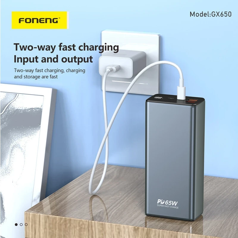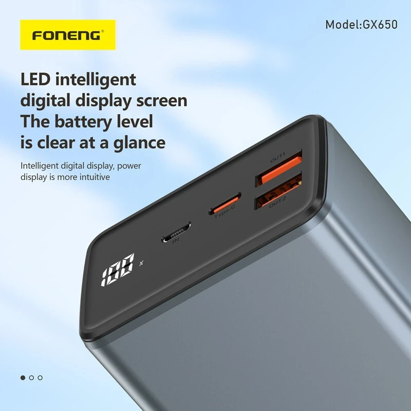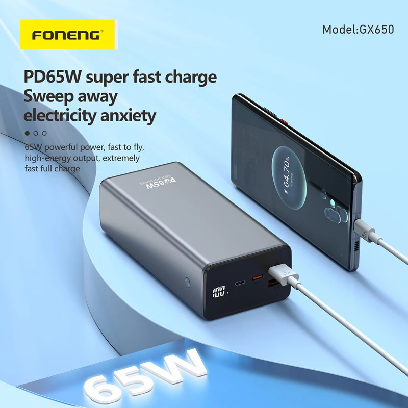 The Foneng GX650 65W 30,000mAh Power Bank is a powerful, versatile charging solution for smartphones, tablets, laptops, and more. With three output ports and support for multiple fast-charging protocols (PD, QC3.0, PPS), it delivers efficient and rapid charging for multiple devices simultaneously.
