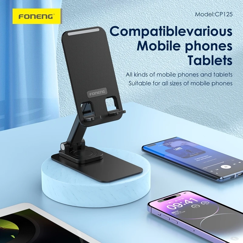 The FONENG CP125 is a stylish and ultra-functional desktop phone holder designed for everyday use at home, work, or on the go. Crafted with a durable metal body, this foldable and fully rotatable stand offers perfect ergonomics, hands-free convenience, and universal compatibility—all in one compact design.
