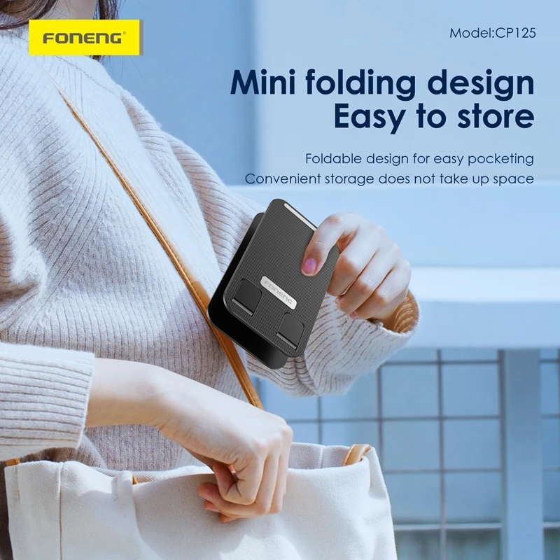 The FONENG CP125 is a metal foldable phone holder with a stable metal base and silicone panel that prevents slipping and damage to devices. Its mini folded design makes it easy to store and doesn't take up much space. With its double-axis design, it allows for a 360° free adjustment of a comfortable angle and is suitable for all sizes of mobile phones on the market, thanks to its ABS material and aluminum alloy lift and adjust design.